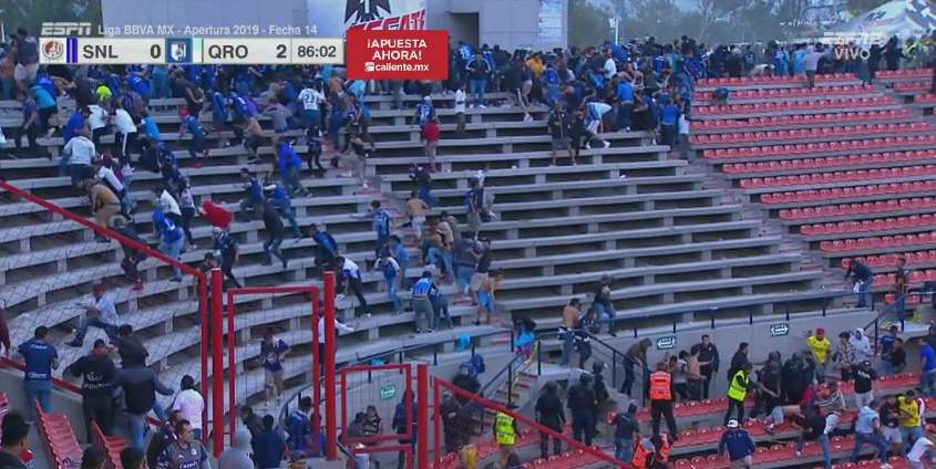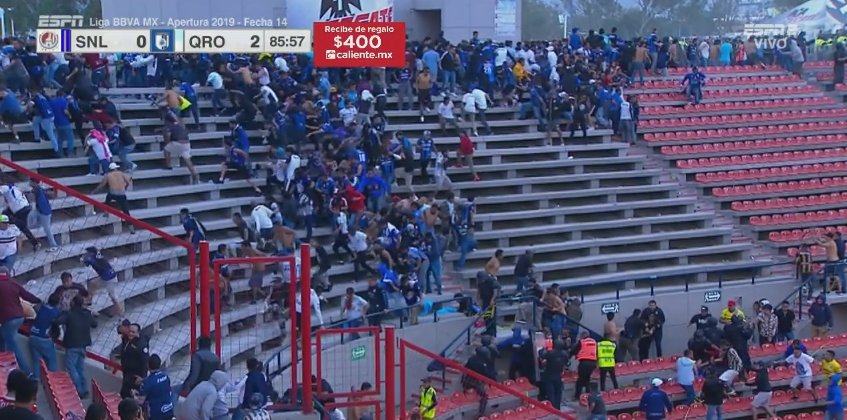 Previo a ese incidente, al minuto 50, ya se había dado un brote de violencia en esa misma área cuando seguidores de Gallos Blancos agredieron a los potosinos que estaban sentados en las gradas de la zona inferior, por lo que tuvieron que ser reinstalados a la zona de sombra.