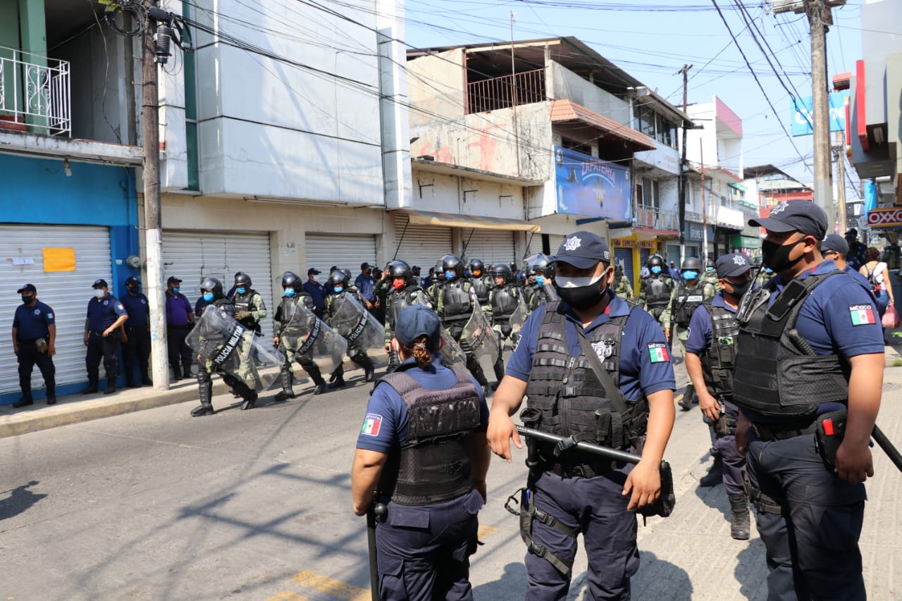 Con la presencia de elementos de la guardia nacional, funcionarios públicos y medios de comunicación, que sin respetar la sana distancia, piden a la población «quedarse en casa», esta mañana el gobierno municipal comenzó a ejecutar acciones para evitar el contagio del Covid-19.