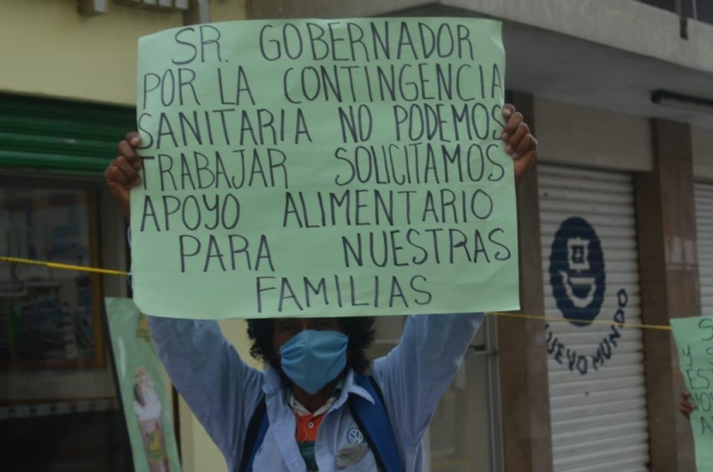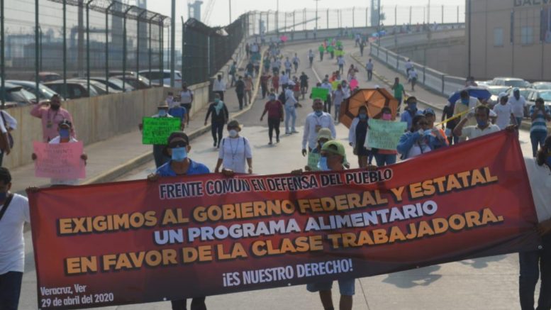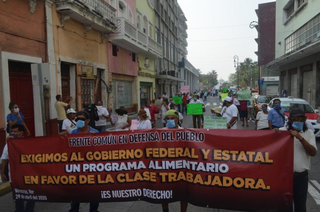Veracruz, Ver.- Unos 600 trabajadores desempleados, vendedores ambulantes sin ventas, empleados del sector turístico sin ingresos por las playas cerradas, amas de casa, lancheros, taxistas, boleros y muchos otros sectores se manifestaron por las calles principales del puerto jarocho para demandar atención de los 3 niveles de gobierno, pues debido a la contingencia sanitaria por la pandemia de COVID-19 han perdido sus fuentes de ingreso y están pasando hambre en sus hogares, por lo que exigen la instrumentación de un programa de distribución de alimentos que les permita recluirse en sus casas para no exponerse al virus ni contribuir en su propagación.