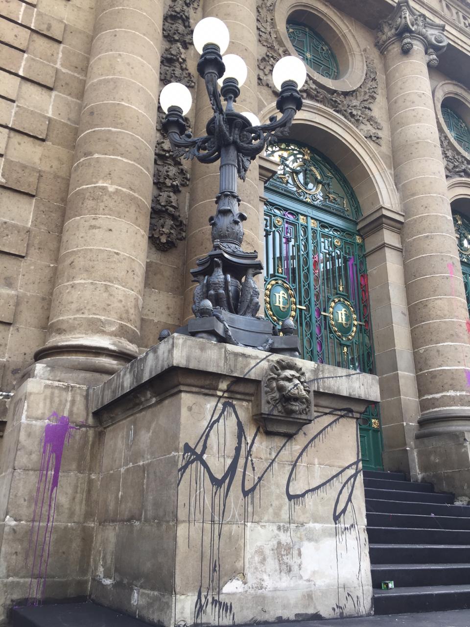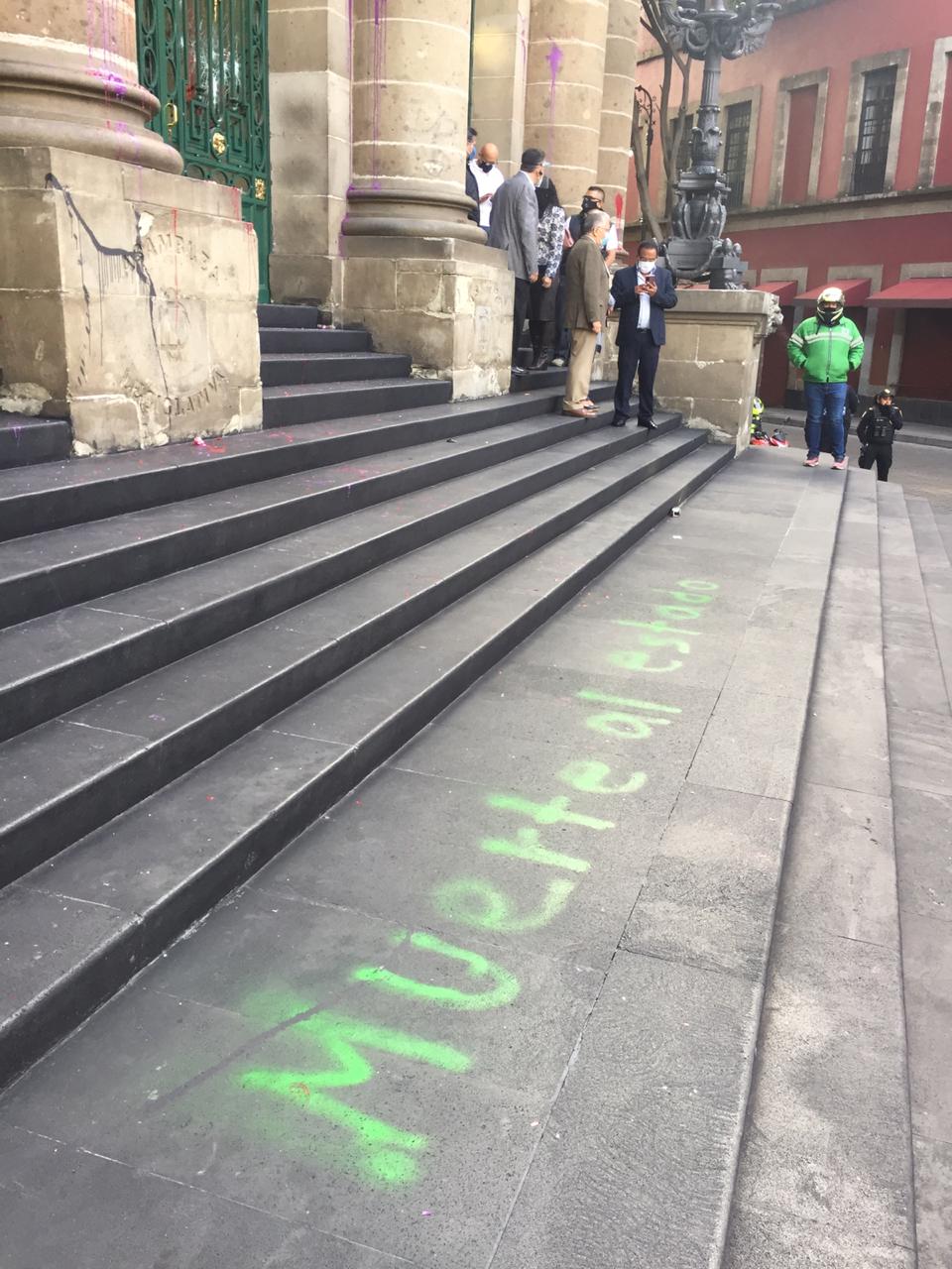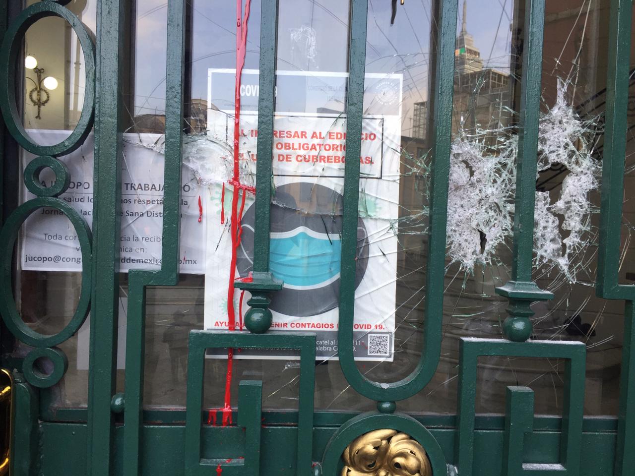 Cristales rotos y pintas con mensajes como ‘Muerte al Estado’ forman parte de la fachada del Congreso capitalino esta maรฑana, sin que se sepa quiรฉnes provocaron los daรฑos