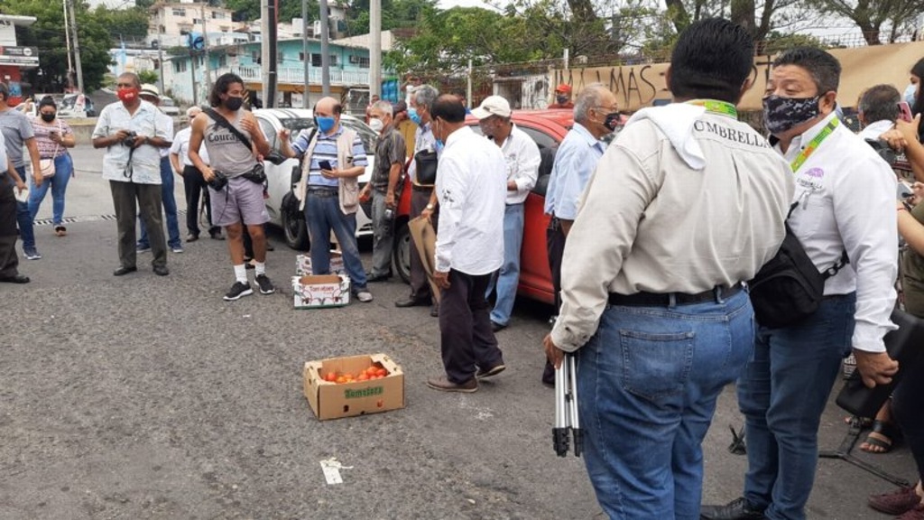 Los manifestantes lanzaron galones de agua de drenaje en las dos entradas de las oficinas; también aventaron tomates y huevos a las instalaciones.