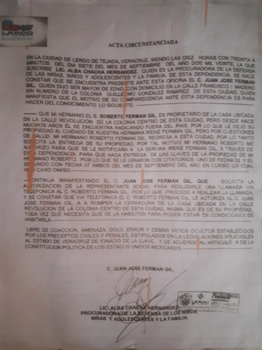 En dicho documento expedido por el DIF municipal se manifiesta a grandes rasgos que el señalado acudió a sus instalaciones manifestando que uno de sus hermanos de nombre Roberto es el propietario de la casa, sin embargo no cuenta con documentación que lo acredite ya que se encuentra en el extranjero, por lo que ante la presencia de la Procuradora el citado Juan José realizó una llamada telefónica a su hermano Roberto quien afirma ser el propietario y autoriza que Juan José tome posesión de dicha propiedad, siendo ese argumento base suficiente para la Procuradora para emitir un “Acta circunstanciada” donde se autoriza romper la cerradura e ingresar a la vivienda, lo cual a las hermanas de la afectada les parece además de un abuso un acto completamente ilegal.