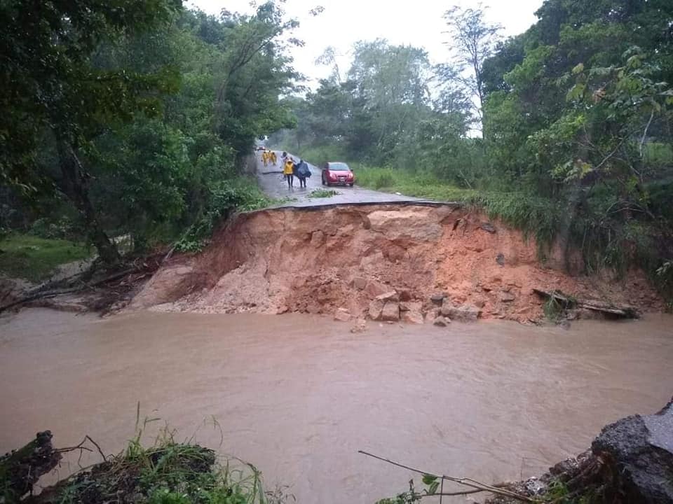 Las fuerte corriente de las lluvias intensas registradas que no cesan lo derribó, partiendo la carretera en dos prácticamente.