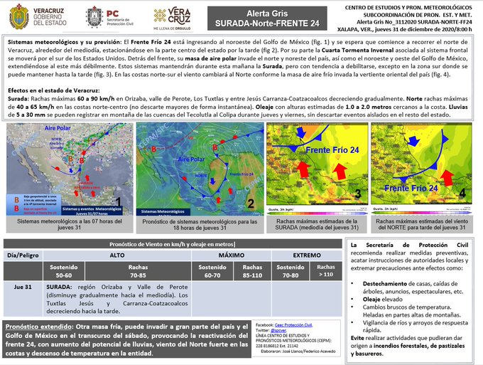 Según una alerta gris emitida por la dependencia, se espera el ingreso del Frente Frío Número 24 al estado de Veracruz a partir del mediodía de este jueves 31 de diciembre.