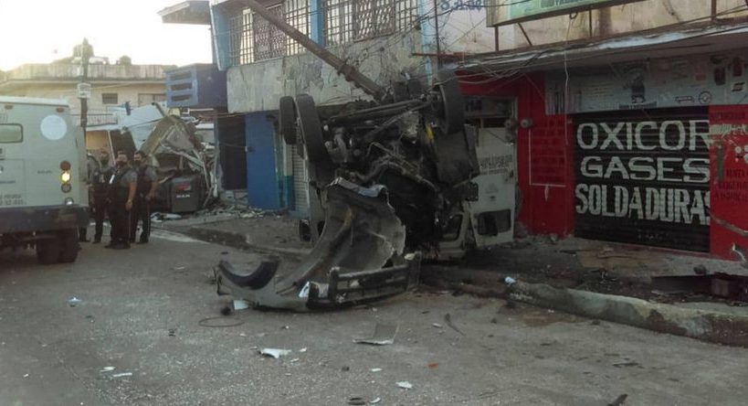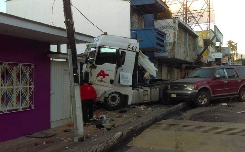Este aparatoso accidente se registro la mañana de este Viernes sobre el bulevar Miguel Alemán entre calles 27 y 29. Al momento del choque, el tractocamion dañó una camioneta Ford Expedition estacionada y terminó chocando contra una vivienda, mientras que la camioneta de valores derribó un poste de la CFE y dañó al menos tres inmuebles.