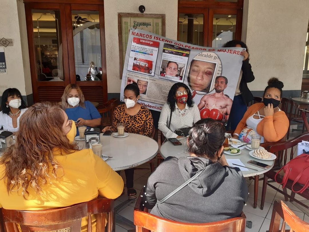 Cabe mencionar que las mujeres manifestantes mostraron una lona con la imagen de una mujer golpeada, al tiempo que exigían el cese de la violencia contra este sector, y donde señalan a Marcos Isleño como golpeador de mujeres.
