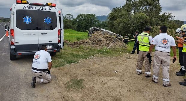 La pinchadura de una llanta delantera en el costado del acompañante, provocó que el conductor de una automóvil; perdiera el control y volcará en varias ocasiones para terminar en un pequeño barranco, con saldo de una persona fallecida y otras dos lesionadas de gravedad.
