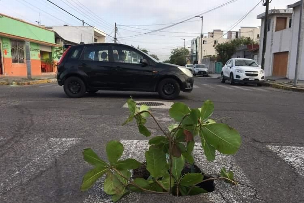 En la calle 2 de abril esquina con Luz Nava de la colonia Ignacio Zaragoza, un socavón fue señalizado con una rama de almendro.