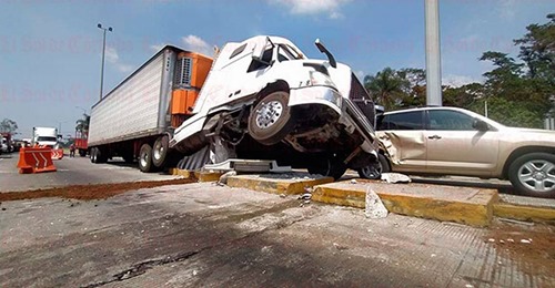 Fortín, Ver.- Un tráiler sin frenos arrolló a dos automóviles cuando se encontraban en fila para pasar la caseta de peaje 045 de esta localidad, generando pérdidas materiales por varios miles de pesos y caos vial.