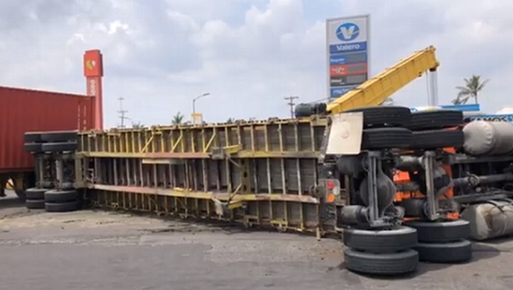 Un tráiler de doble remolque se volcó en la zona norte del municipio de Veracruz cuando buscaba incorporarse a la autopista Veracruz-Cardel.