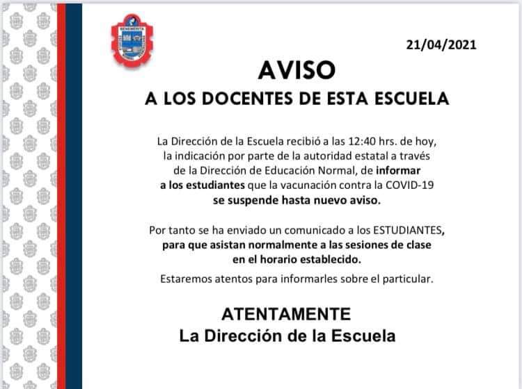 Pasadas las dos de la tarde, la página oficial de la Normal Veracruzana emitió un comunicado para la comunidad estudiantil en el que confirmó que, después de las 12 horas de este 21 de abril, la Secretaría de Educación de Veracruz (SEV) ordenó suspender la vacunación para los alumnos.