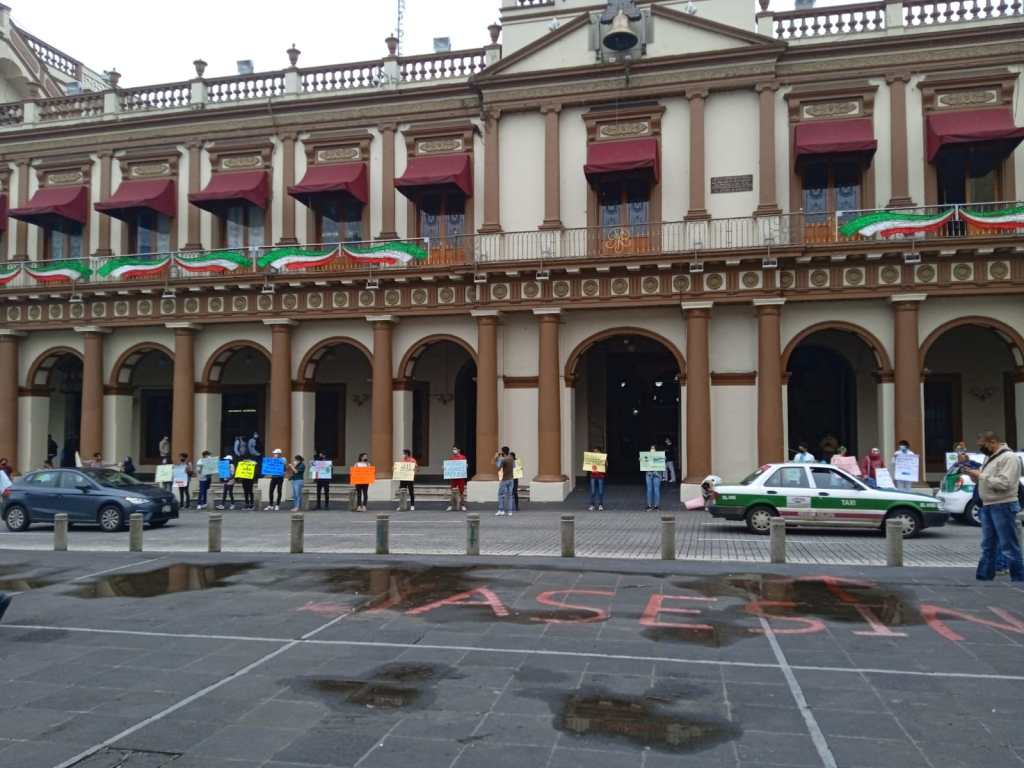 Mediante pancartas con consignas en contra del retorno a las aulas planeado para el próximo lunes 30 de agosto, los jóvenes se plantaron en los alrededores de la plaza Sebastián Lerdo de Tejada y el Palacio de Gobierno.