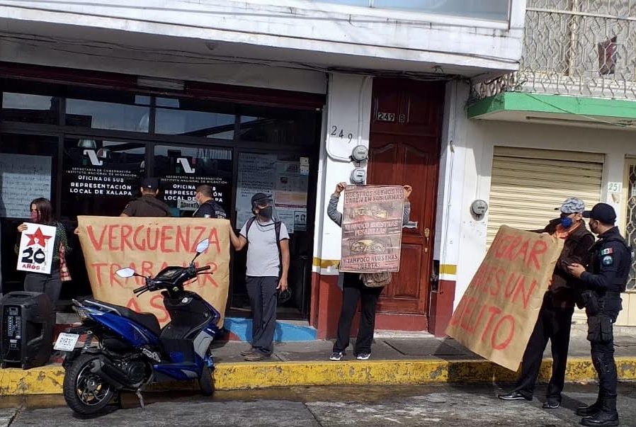 Un grupo de activistas protestó afuera de las oficinas del Instituto Nacional de Migración (INM), municipio de Xalapa, para exigir que cese la persecución contra los haitianos que huyen de su país y pasan por Veracruz con dirección a Estados Unidos.