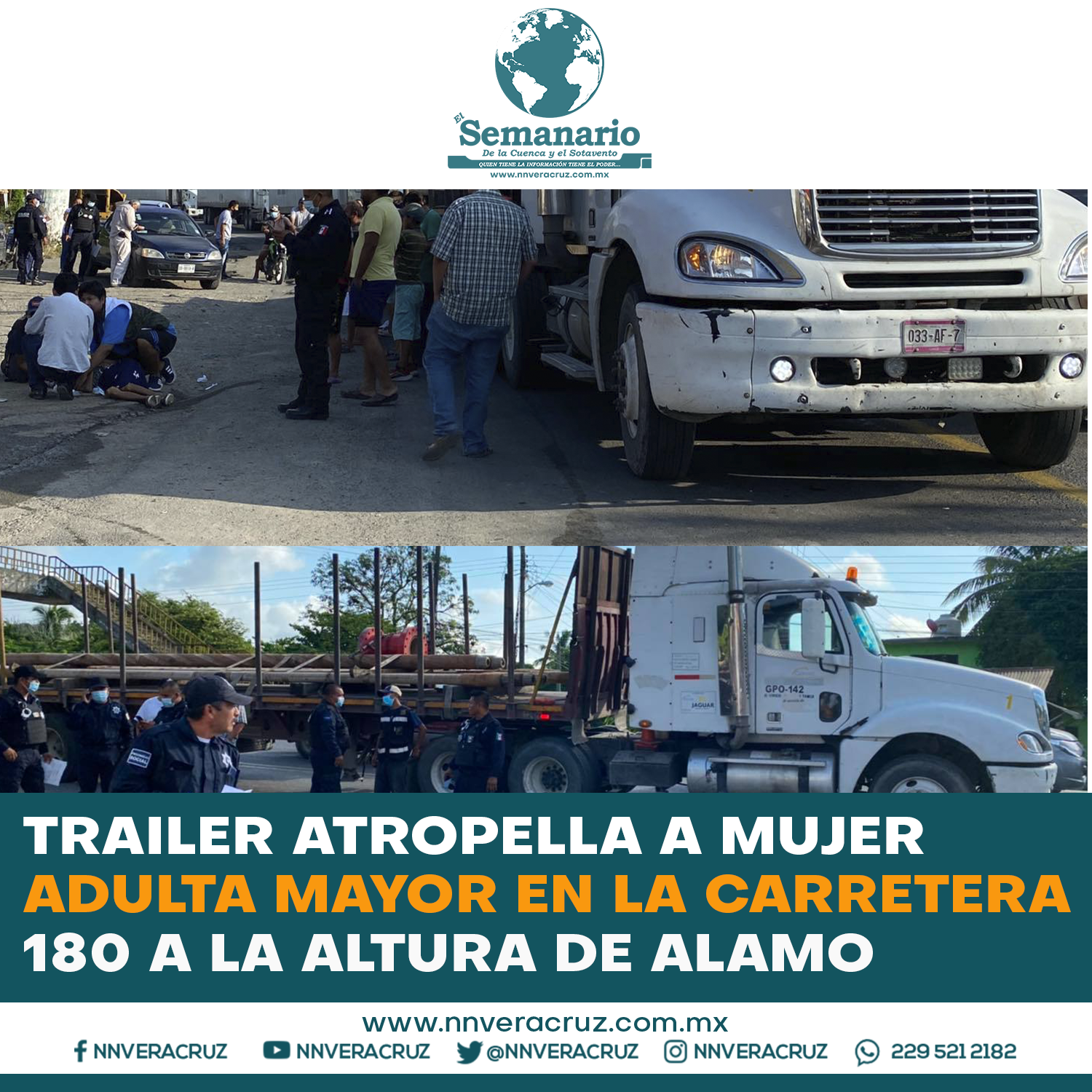 Una persona de la tercera edad fue embestida por un camión de carga, cuando esta se encontraba por cruzar la carretera federal 180 a la altura de la localidad de Chapopote Núñez, la mujer quedó tendida a un costado de la cinta asfáltica, en donde fue atendida por paramédicos locales.