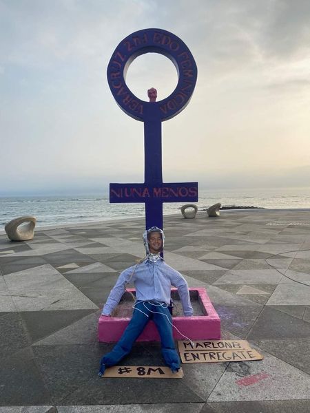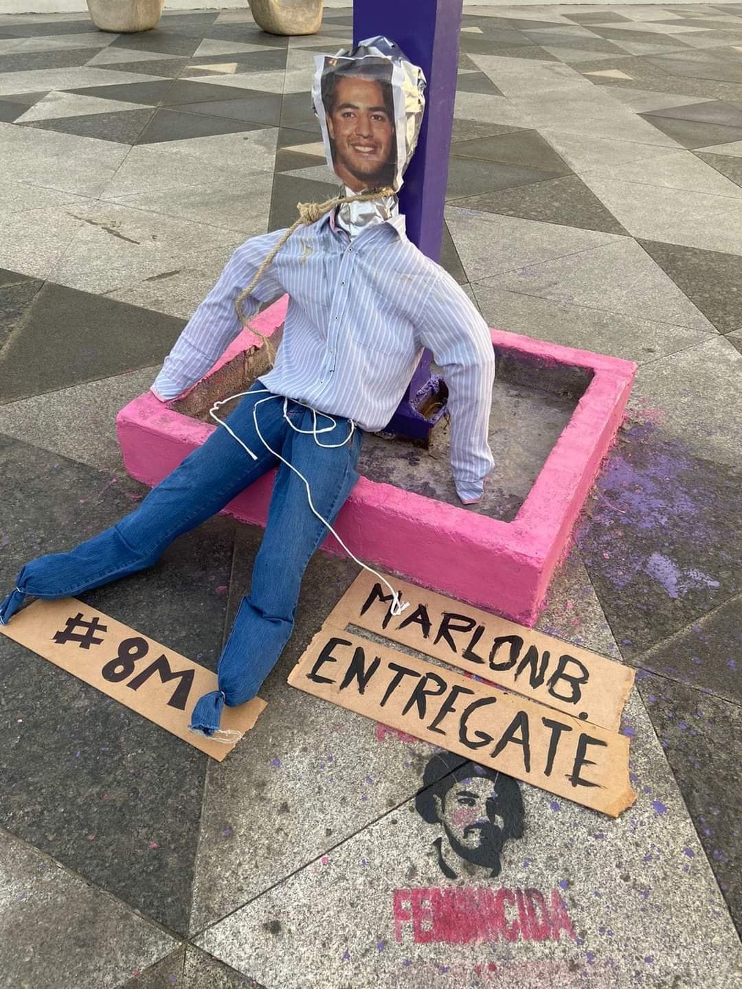 Junto al muñeco había una pinta con su rostro, el cual tenía la palabra «Feminicida»; además, un cartel qué decía «Marlon «B» entrégate», y a la par al hashtag #8M.