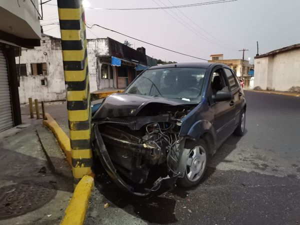 El conductor de un vehículo marca Ford tipo Fiesta color negro terminó impactándose de frente en un poste de concreto de la CFE ubicado en la esquina de la calle Constitución.