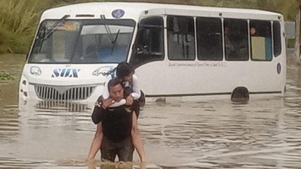 De igual manera, elementos de la Policía Estatal participan en labores de ayuda y rescate de pasajeros del servicio de transporte público que quedaron atrapados por las inundaciones.