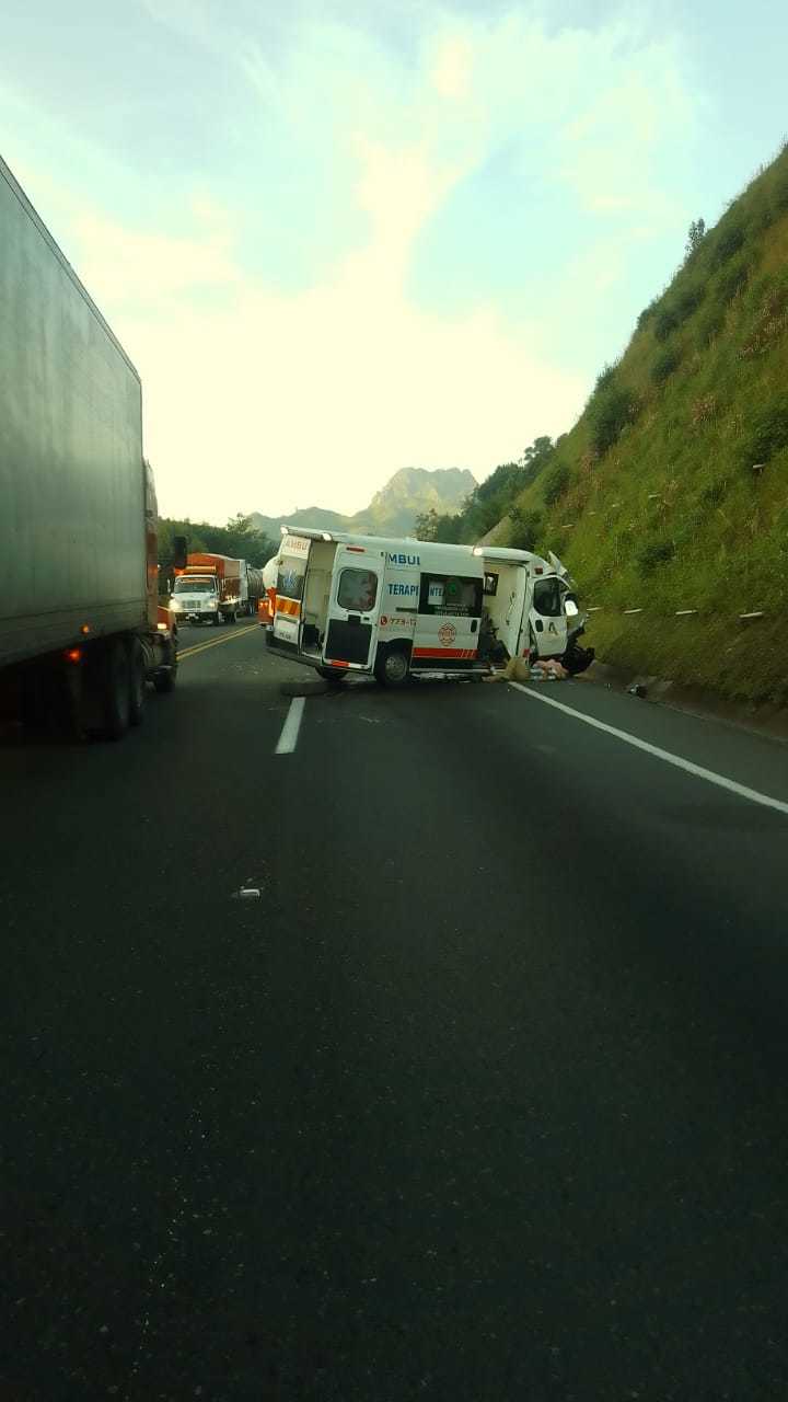 Uno de los accidentes ocurrió sobre el kilómetro 135 de la citada pista, en donde se vio involucrada en un choque frontal una ambulancia de terapia intensiva de protección civil del estado de Hidalgo, que trasladaba una persona que perdió la vida y una más que resultó herida.