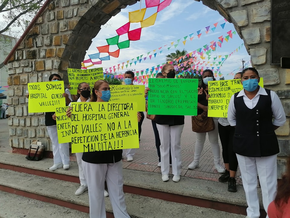 CIUDAD VALLES. Trece trabajadores del Hospital General de Valles se manifestaron contra actos prepotentes, maltrato físico, acoso laboral e incluso incapacidad profesional para el cargo de la directora de ese nosocomio, Mónica González Mojica esta mañana en la Plaza Principal.