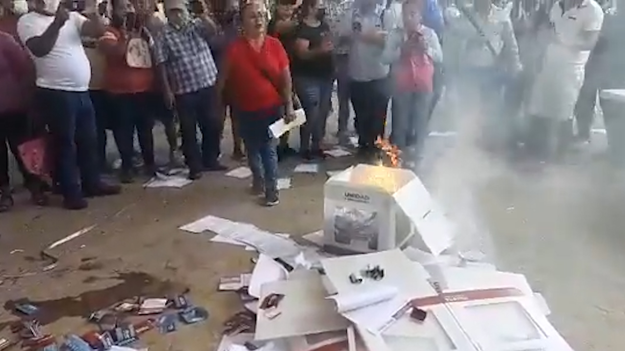 Un hecho similar ocurrió en el municipio de Huehuetán, en Chiapas, donde un grupo de hombres ingresó al sitio para tomar las urnas, destruirlas y luego quemar las boletas.