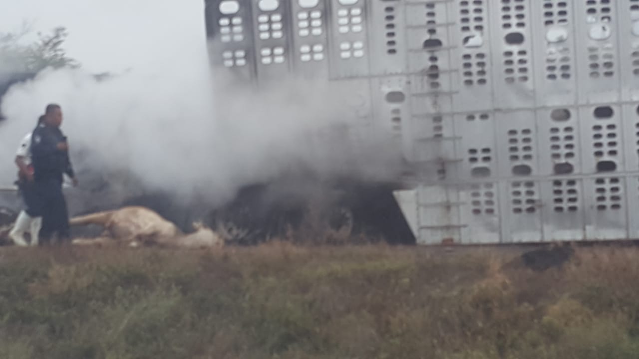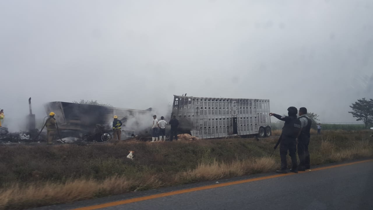 Datos preliminares indican que una trailer tipo góndola o madrina que transportaba ganado se impactó por alcance en la parte posterior de un trailer con caja seca para el transporte de materiales, el choque originó fuego que consumió parte de las dos unidades.