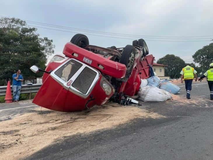 Un tráiler doble remolque quedó volcado la mañana de este jueves cuando su conductor perdió el control en cerrada curva proveniente de la carretera antigua Coatzacoalcos-Minatitlán, bajando el puente la ICA.