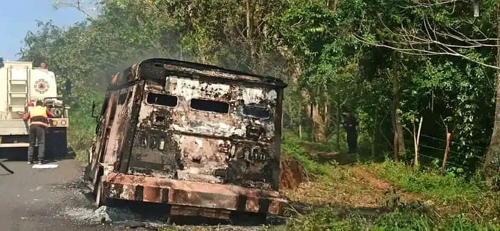Hueyapan de Ocampo, Veracruz.- Durante la mañana de este viernes, una camioneta dedicada a la transportación de valores, se incendió sobre la carretera costera federal 180, tramo que comprende los municipios de Catemaco – Hueyapan de Ocampo, a la altura de la localidad Santa Rosa Cintepec.