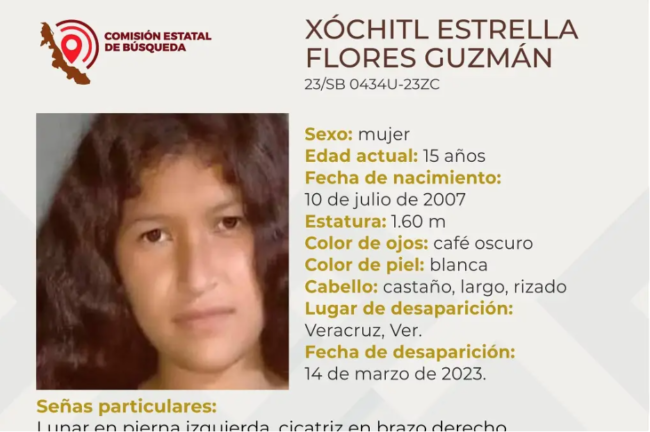 Se trata de Xóchitl Estrella Flores Guzmán, mide 1.60 metros, es de tez blanca, tiene ojos color café oscuro y cabello castaño, largo y rizado.
