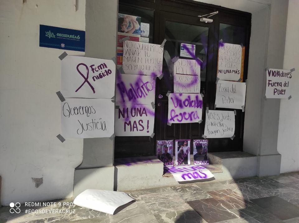 Un grupo de mujeres clausuraron de manera simbólica las oficinas del regidor sexto del ayuntamiento de Veracruz, Sebastián Cano Rodríguez, para exigir que se proceda en su contra tras de las denuncias penales que existen en su contra por abuso sexual y físico en agravio de jóvenes que en su momento tuvieron relación sentimental y de amistad con el acusado. Alrededor de las 8 de la mañana de este lunes, un grupo de alrededor de ocho mujeres arribaron a las afueras de las oficinas del regidor, mismas que se ubican en la parte posterior del Palacio Municipal que da hacia la calle de Zaragoza. De inmediato, las manifestantes iniciaron las puntas y la colocación de carteles con las leyendas en contra del Edil de extracción Morenista, donde lo acusan de abuso sexual y exigen que se haga justicia a las víctimas. De igual manera colocaron algunas fotografías del colaborador del regidor, a quien acusan de acoso. Con aerosol morado pintaron y clausuraron la entrada de la oficina del Regidor, y sin ofrecer pronunciamiento alguno acerca de esta acción, se retiraron del sitio. Hasta este momento no ha habido una respuesta de parte del presunto acerca de estas acciones que llevaron a cabo en las oficinas.