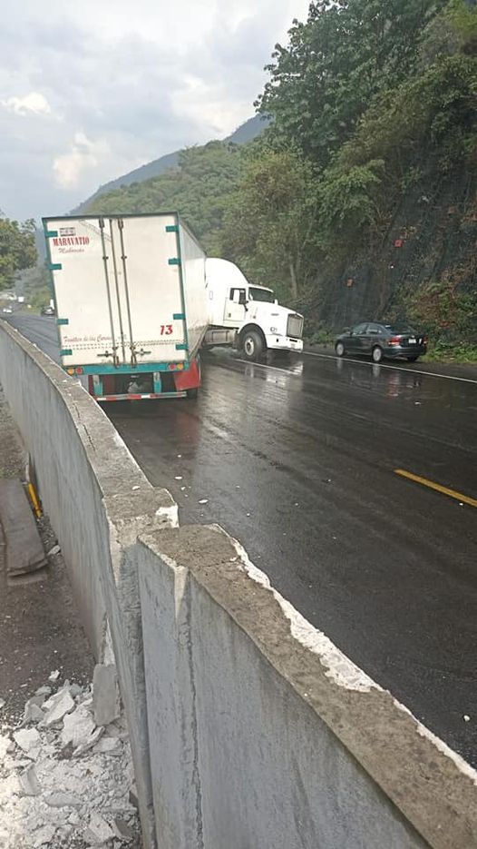 Este accidente se suscitó, cuando un tráiler que remolcaba una caja seca derrapo y se impacto contra el muro de contención de las oficinas del destacamento de la Guardia Nacional división Carreteras, provocando que, la unidad quedará atravesada.