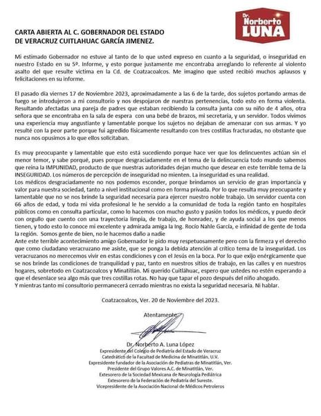 Mediante una carta dirigida al gobernador Cuitláhuac García Jiménez dio a conocer que fue el pasado 17 de noviembre a las seis de la tarde, cuando se metieron a su consultorio dos sujetos que portaban armas de fuego, quienes de forma violenta cometieron el atraco.