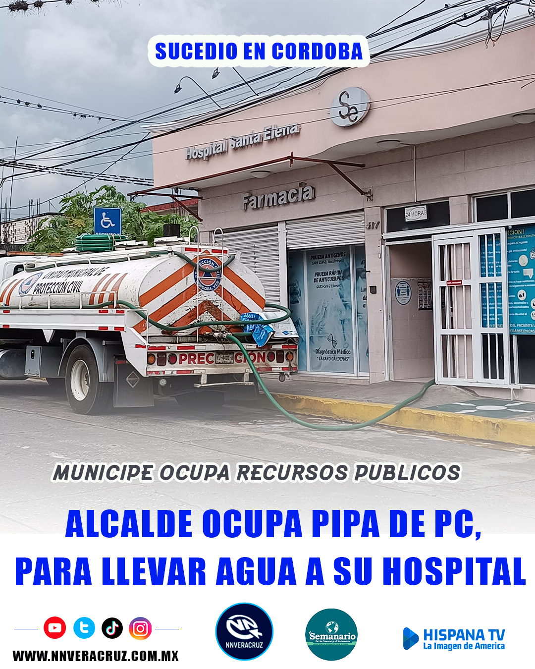 Fue sorprendía una pipa de Protección Civil del Municipio de Córdoba, abasteciendo de agua al hospital propiedad del Alcalde de Córdoba, Juan Flores con lo que se demuestra el abuso de los recursos públicos por parte del Presidente Municipal.