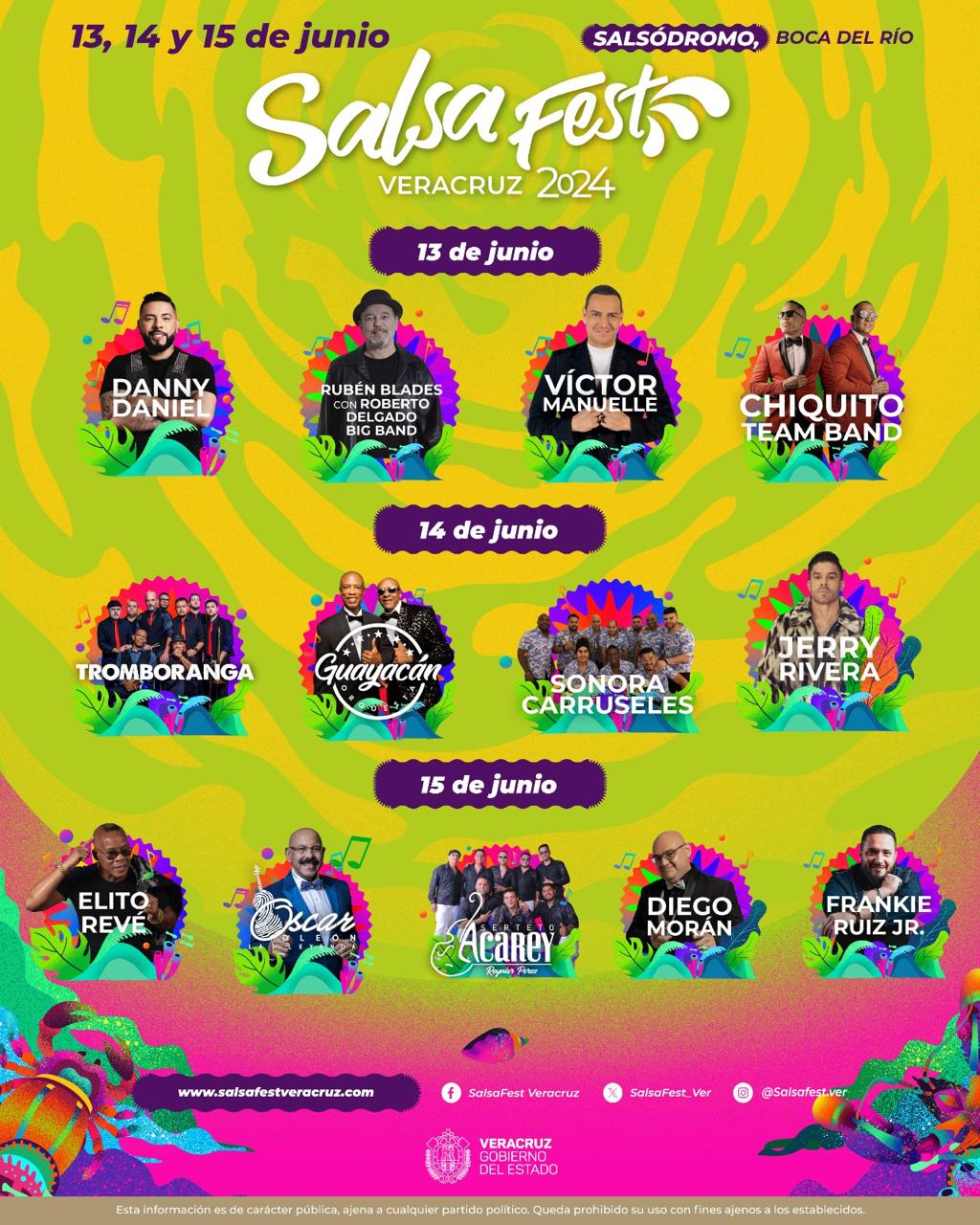 Entre el elenco destacan grandes salseros: Danny Daniel, Rubén Blades con Roberto Delgado Big Band, Víctor Manuelle y Chiquito Team Band el jueves 13; las orquestas Tromboranga y Guayacán, la Sonora Carruseles y Jerry Rivera el viernes 14, además de Elito Revé, Óscar D’León, Septeto Acarey, Olga Tañón, Diego Morán y Frankie Ruiz Jr. el sábado 15.