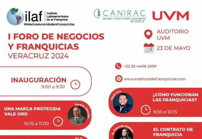 El Instituto Latinoamericano de la Franquicia invitó al I Foro de negocios y franquicias 2024 Veracruz, que se llevará a cabo el próximo jueves 23 de mayo.