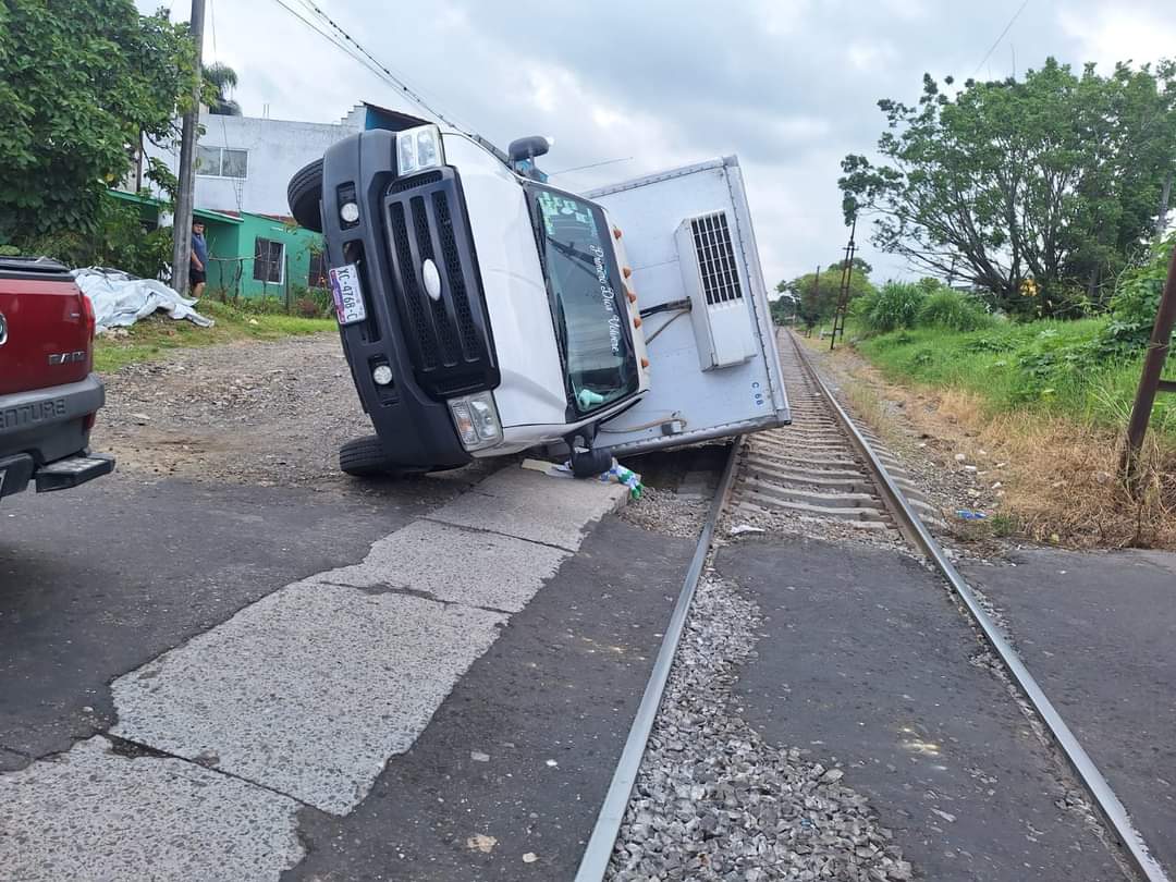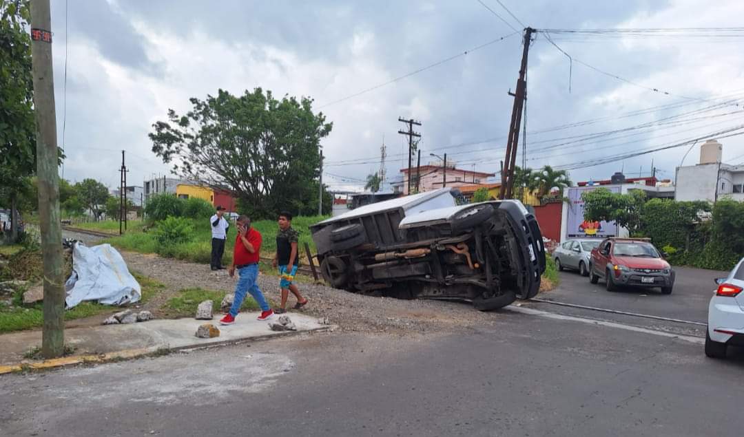 Córdoba ver. -La tarde de este martes el conductor de una camioneta Ford color blanca con caja seca hizo una maniobra y cayo en un desnivel cerca de las vías del tren y quedo volcada del conductor no se tiene conocimiento si salió ileso.