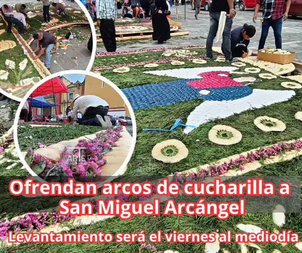 Feligreses pertenecientes a la Parroquia de San Martín Caballero en Atlahuilco ofrendan tres arcos florales para adornar la entrada de la Catedral en honor a San Miguel Arcángel; arcos que fueron levantados este viernes 20 de septiembre al mediodía para arrancar la fiesta patronal.