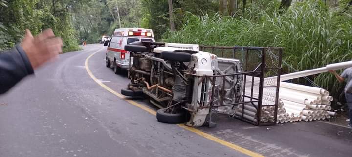 Coscomatepec, Ver.- Una camioneta Nissan cargada con tubos PVC, volcó esta mañana cuando se desplazaba sobre la carretera federal Fortín-Huatusco cerca de la barranca del Río Jamapa en Coscomatepec.