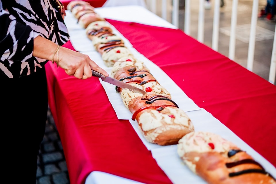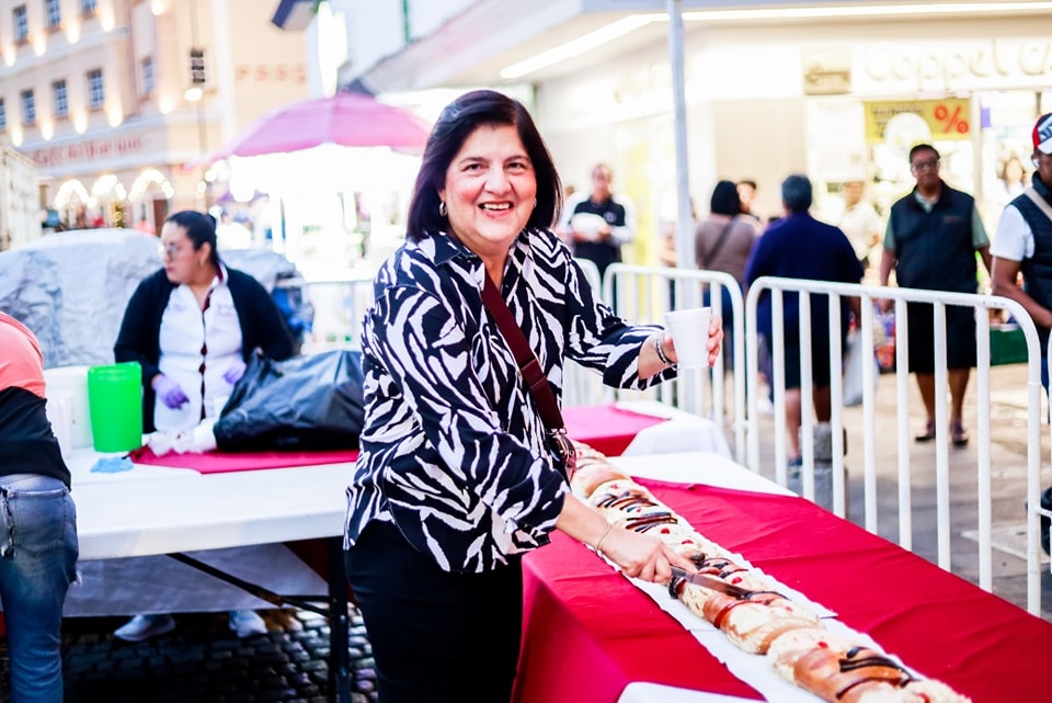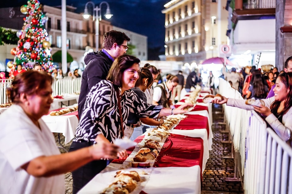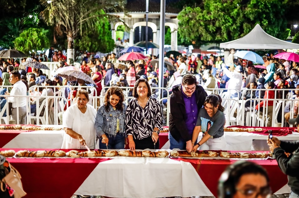 Antes de tomar sus lugares entre el público, las autoridades municipales repartieron entre la gente, rebanadas de la monumental rosca de reyes. Para ello la esposa del Presidente del DIF Municipal, Stefani Salas de Rubio, se sumó al corte de rosca para repartir este tradicional pan entre los niños y padres de familia.