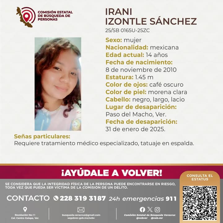 Paso del Macho.- Una adolescente de nombre Iraní Izontle Sánchez, de 14 años de edad, es reportada como desaparecida, ya que familiares indican que fue vista por última vez el pasado domingo y hasta el momento nadie sabe de ella.