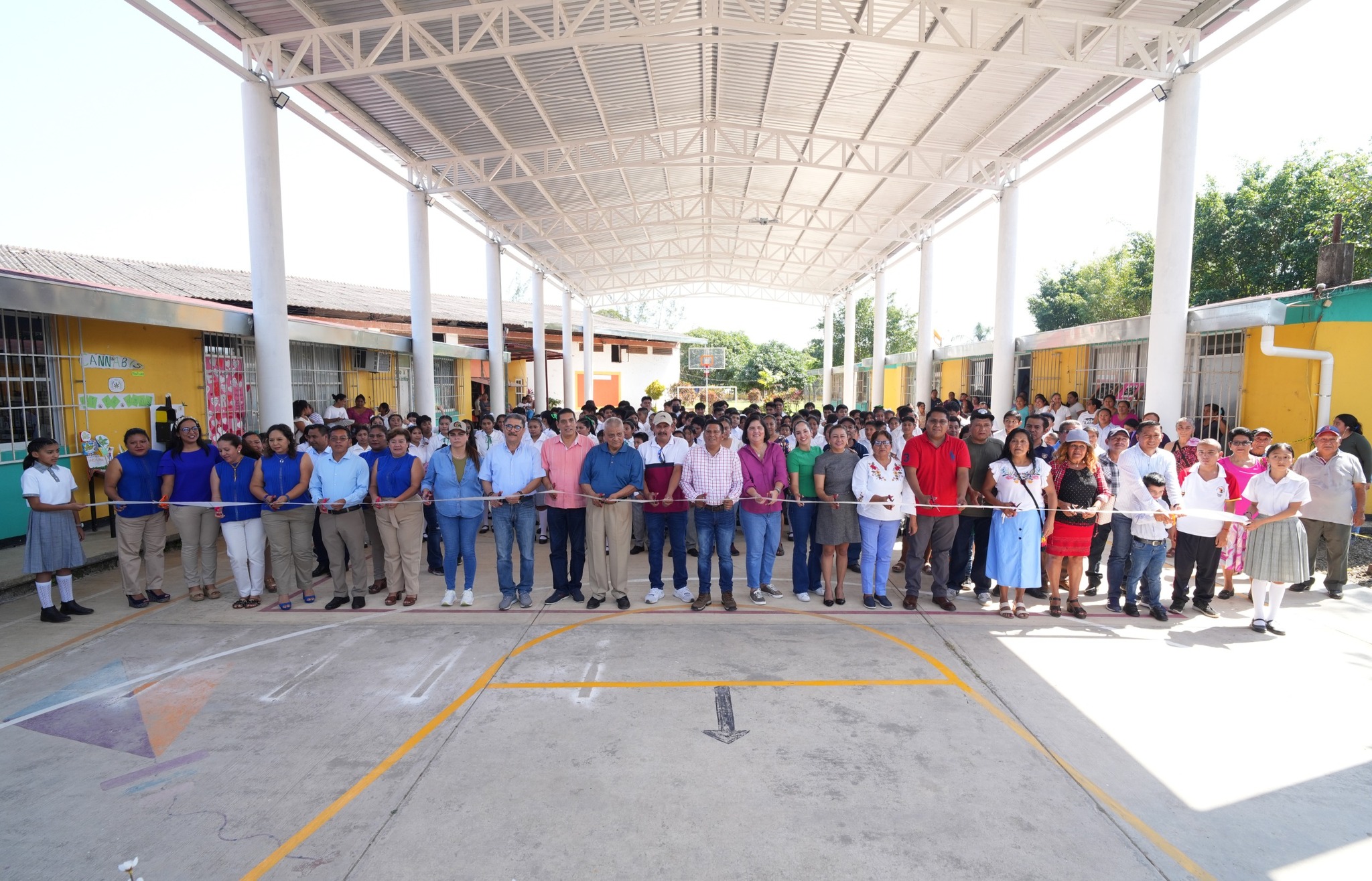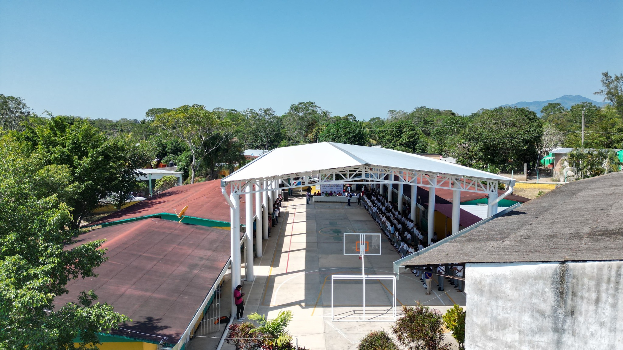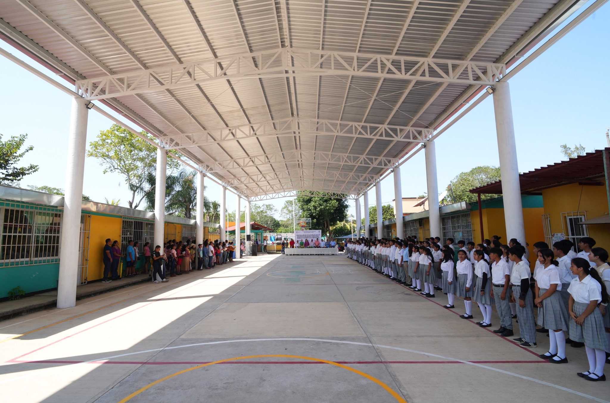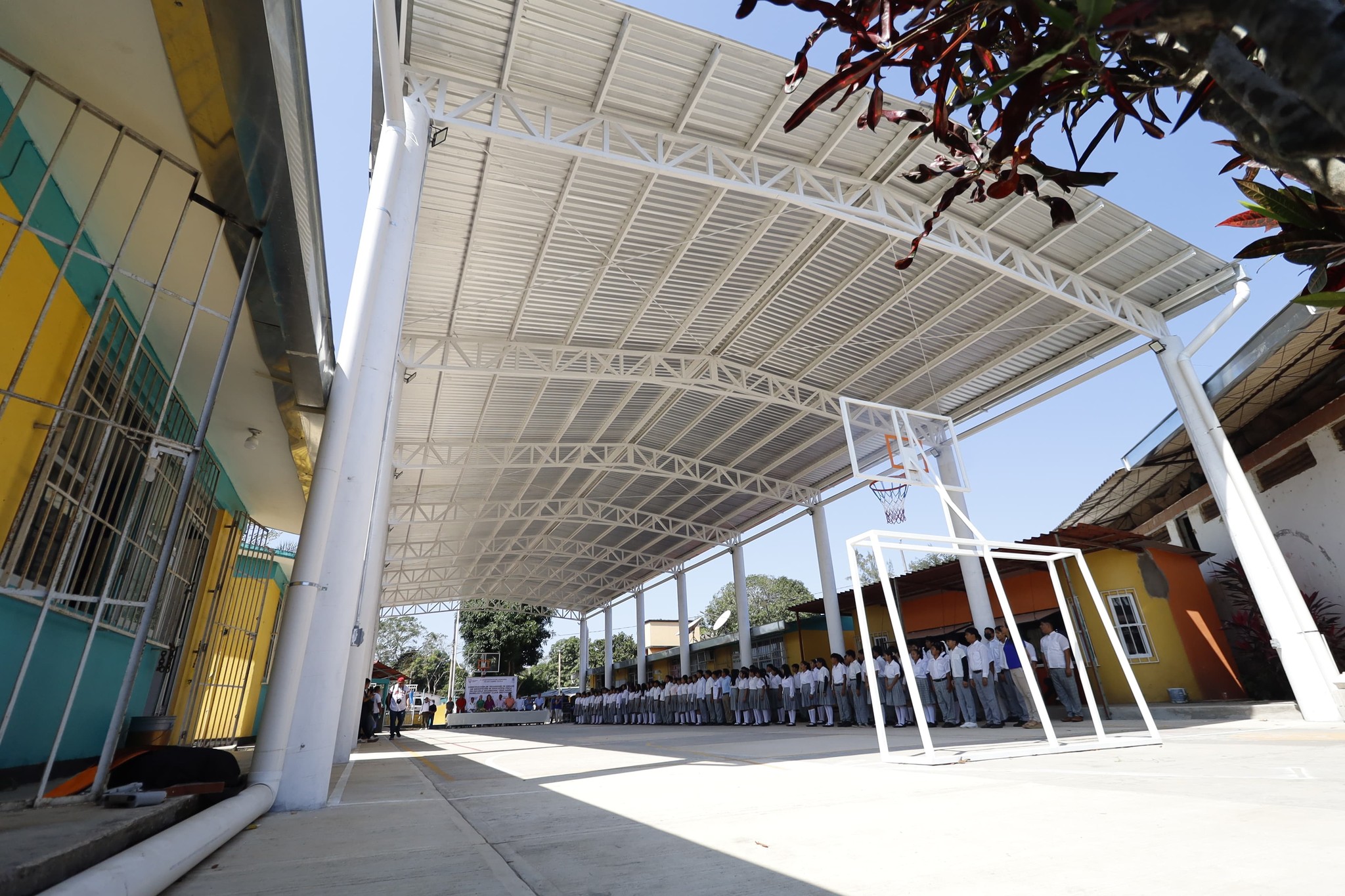 • Con inversión de 1 millón 623 mil 69.47 pesos, se cumplió la meta de techar la cancha de usos múltiples de esta escuela beneficiando directamente a 116 alumnos de la zona rural.