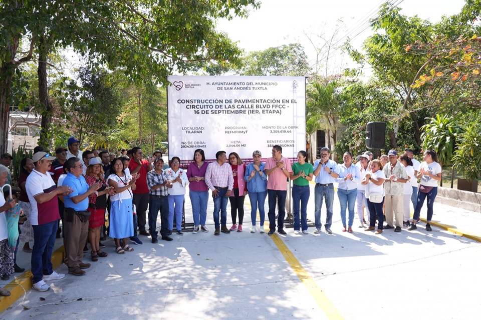 “Estamos muy agradecidos por la pavimentación de esta primera etapa en la calle Ferrocarril y 16 de Septiembre pues es una de las más importantes de nuestra comunidad, gracias por esta gran obra, como siempre hemos reconocido es usted una mujer de palabra que cumple sus compromisos”, expresó el Agente Municipal de Tilapan, Lino Huguet Ramírez Sosa, al dar las palabras de bienvenida a la Presidenta Municipal de San Andrés Tuxtla, la doctora María Elena Solana Calzada, y su cuerpo edilicio en la inauguración de la obra de pavimentación en las calles mencionadas.