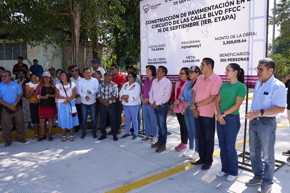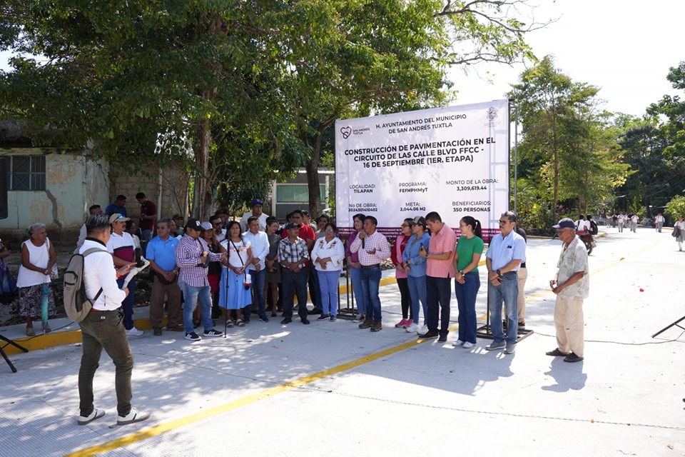 “Estamos muy agradecidos por la pavimentación de esta primera etapa en la calle Ferrocarril y 16 de Septiembre pues es una de las más importantes de nuestra comunidad, gracias por esta gran obra, como siempre hemos reconocido es usted una mujer de palabra que cumple sus compromisos”, expresó el Agente Municipal de Tilapan, Lino Huguet Ramírez Sosa, al dar las palabras de bienvenida a la Presidenta Municipal de San Andrés Tuxtla, la doctora María Elena Solana Calzada, y su cuerpo edilicio en la inauguración de la obra de pavimentación en las calles mencionadas.