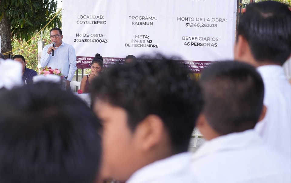 En Coyoltepec, se inauguró la obra de techado en la cancha de usos múltiples de la primaria “Nicolás Bravo”, obra con la que se beneficia directamente a 46 alumnos y se deja un beneficio para futuras generaciones.
