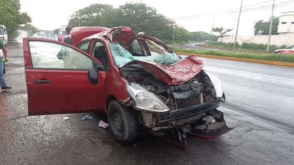 En el choque se vio involucrado un automóvil Versa color rojo que quedó con daños considerables en el parabrisas y cofre.