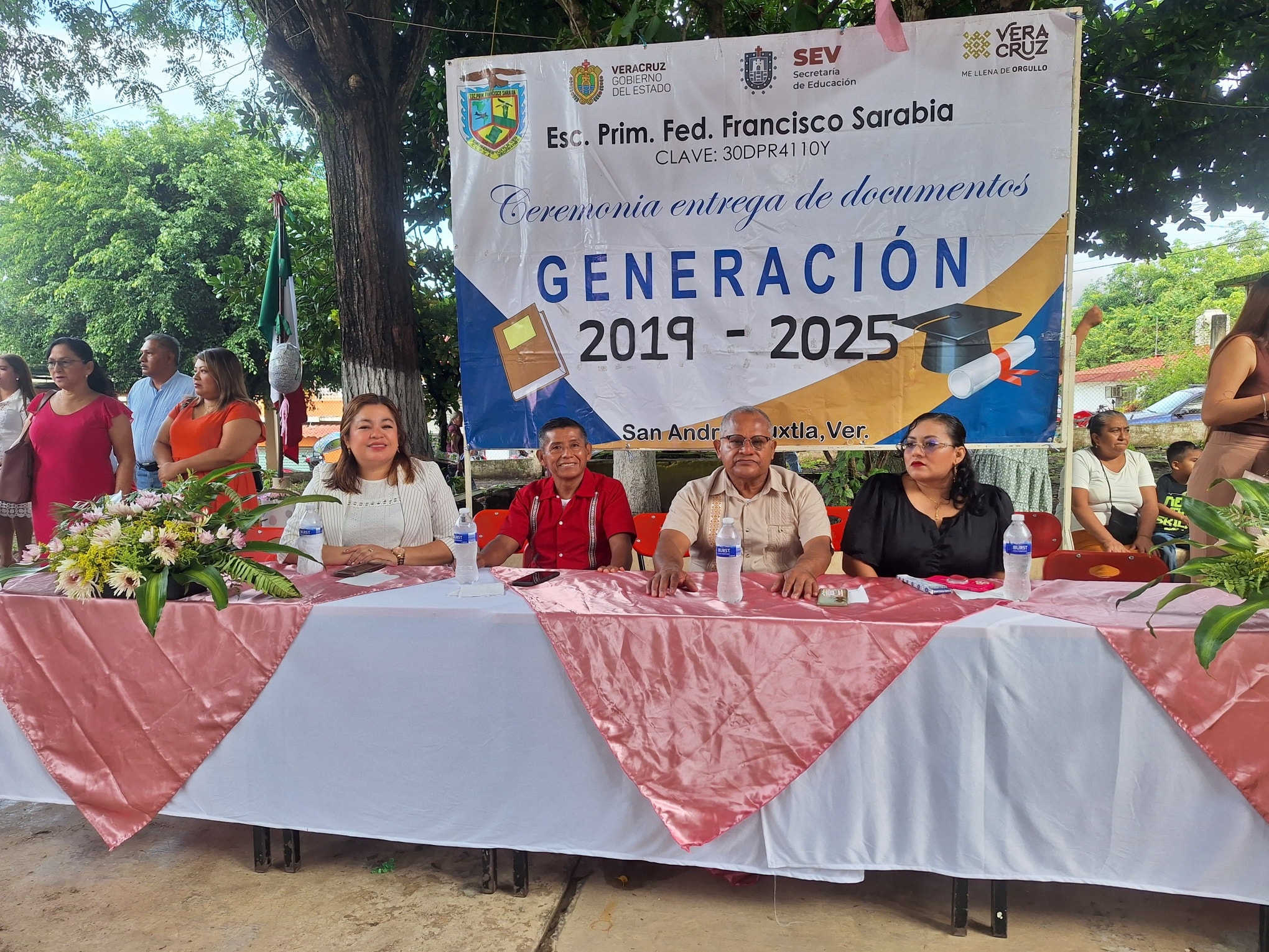 San Andrés Tuxtla, Ver.- En representación de la alcaldesa de San Andrés Tuxtla, la doctora María Elena Solana Calzada, este martes 8 de julio, la regidora primera, la maestra María Elida Pino Villaseca, acudió a la ceremonia de Clausura del Ciclo Escolar 2024-2025 y graduación de la generación 2019-2025 de la escuela primaria “Francisco Sarabia”.
