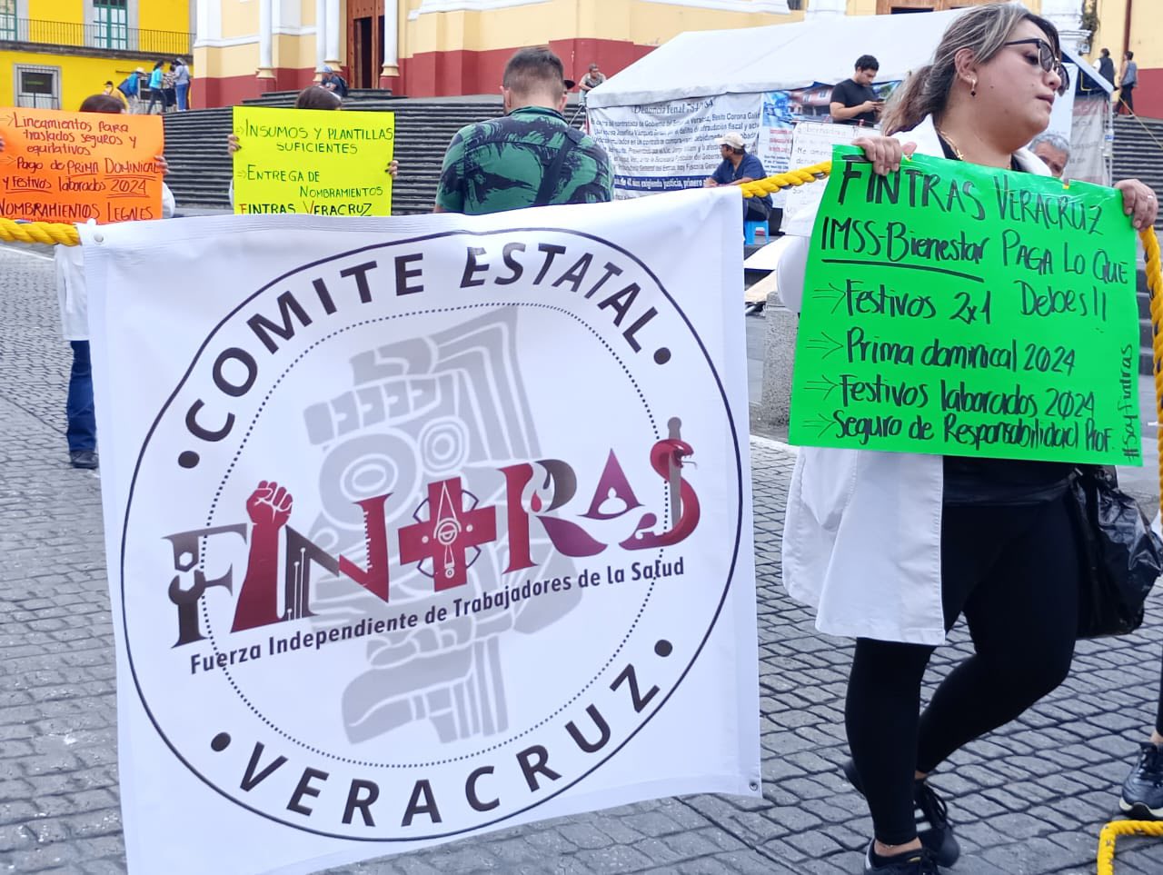 •El paro nacional de trabajadores del IMSS Bienestar, bloquearon la calle de Enríquez de la ciudad de Xalapa, con cartulinas y lonas exigiendo sus derechos laborales, piden la activación fonacot, alto a la violencia institucional en Veracruz, una circular hora de guardería, lineamientos para traslados seguros y equitativo, el pago de prima dominical, y de días festivos laborales desde el 2024 a la fecha no han recibido pagos caídos así como también nombramientos legales.