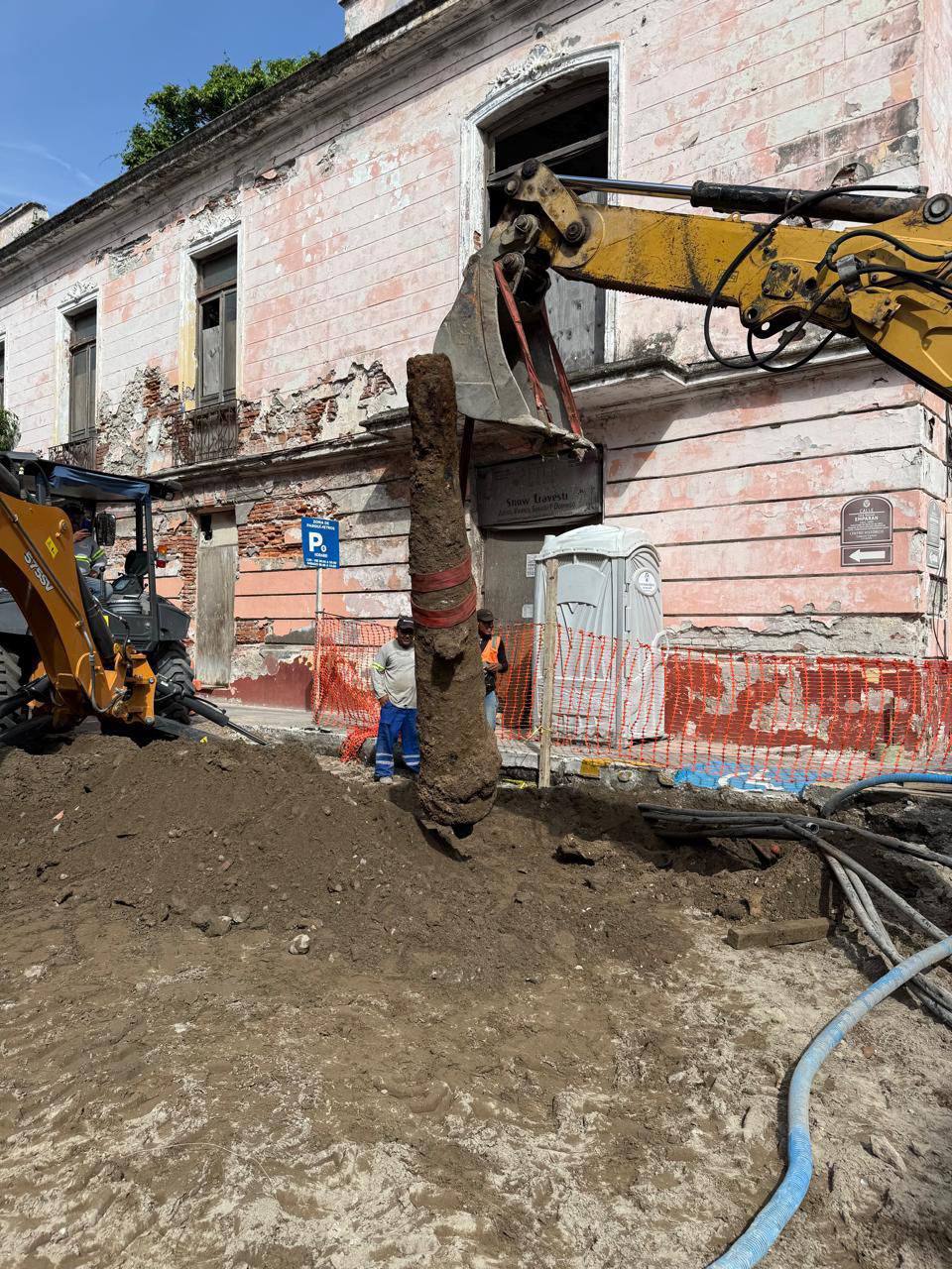 *Veracruz, Ver., 28 de julio de 2025.-* Durante los trabajos de la segunda etapa de rehabilitación en el Centro Histórico de Veracruz, fue descubierto un segundo cañón antiguo entre las calles Independencia y Emparan.