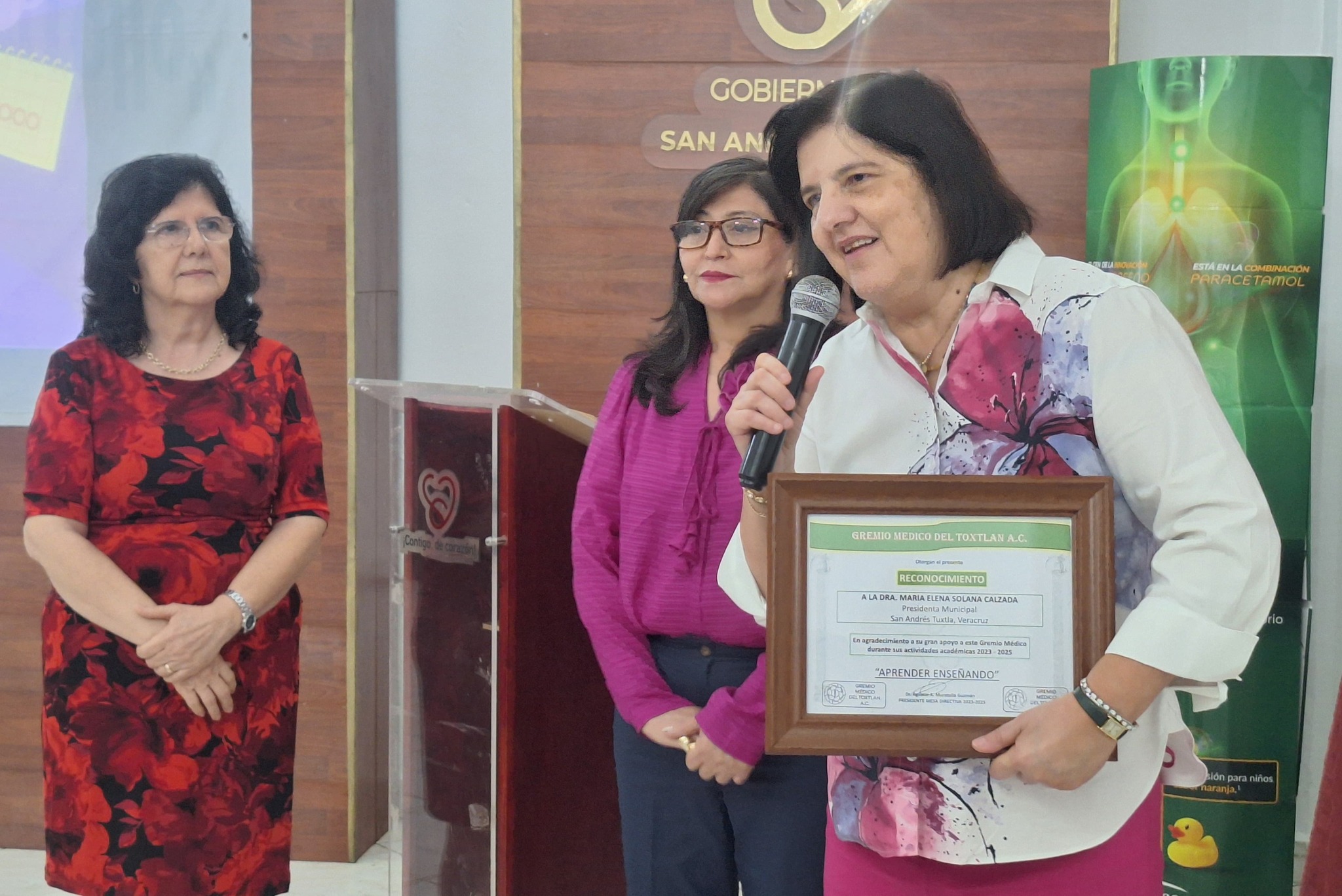 San Andrรฉs Tuxtla, Ver.- La noche de este jueves 31 de julio, en la sala de cabildos del Palacio Municipal de San Andrรฉs Tuxtla, en el marco de la renovaciรณn de su mesa directiva, integrantes de la Sociedad Mรฉdica de la regiรณn de Los Tuxtlas, entregaron a la Presidenta Municipal, la doctora Marรญa Elena Solana Calzada, un significativo reconocimiento por el respaldo a las actividades de su asociaciรณn, asรญ como a las acciones para dar cumplimiento a la agenda de salud municipal.
