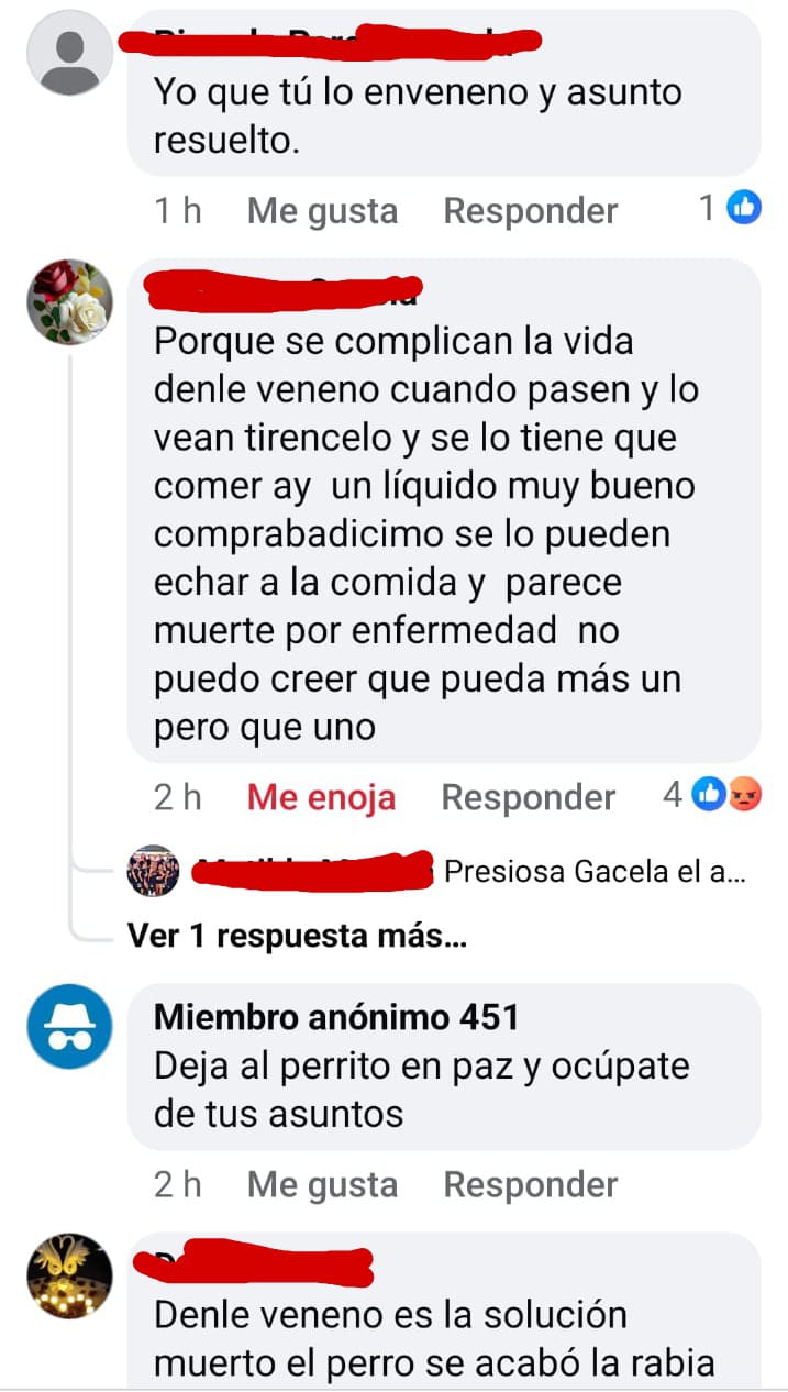 La activista explicó que, previo a los hechos, en redes sociales circularon publicaciones donde se denunciaba el comportamiento de uno de los perros, señalado de atacar a transeúntes. En esos mismos comentarios, algunos usuarios advirtieron que lo envenenarían, lo cual finalmente ocurrió.