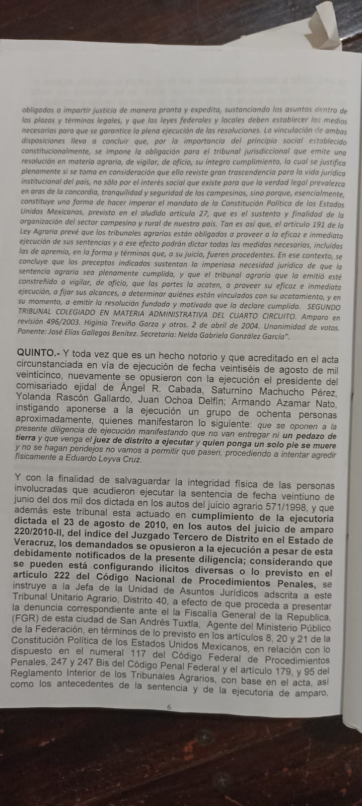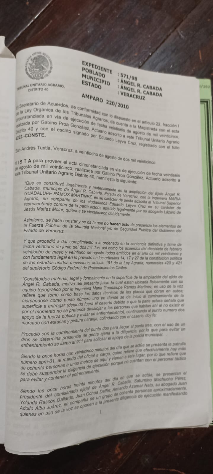 Por su parte, el titular del comité de vigilancia del Ejido, Armando Azamar Nato, aseguró que no permitirán que el tribunal ejecute sobre los terrenos que no corresponden a la sentencia, por lo que hicieron un llamado a la presidenta de la república Claudia Sheinbaum Pardo así como a la gobernadora Rocío Nahle, actuar en consecuencia.